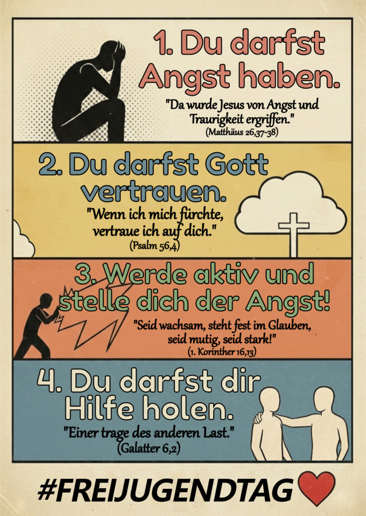 In vielen Gemeinden ist der Umgang mit Angst ein schwieriges Pflaster. Sätze wie „Du musst einfach mehr Gottvertrauen haben“ oder „Hab doch keine Angst“ fühlen sich oft nach Sackgasse an und helfen im Alltag kaum weiter. Deshalb haben wir für den Freijugendtag eine A5-Postkarte entworfen, die das Thema auf den Punkt bringt. CC BY-NC-ND 4.0